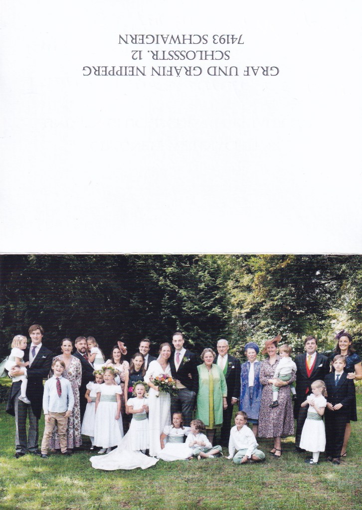 The reply is in the form of a card which on the front has a picture of the Neipperg family taken at the wedding of their son and inside is a typed message in German and is hand signed by The Gräfin.