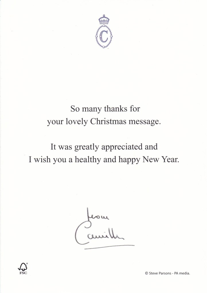 The reply is in the form of a photocard which on the front has a picture of Her Royal Highness taken by Steve Parsons and on the reverse is a message thanking me for my Christmas Wishes and a good 2022 and the printed signature of Her Royal Highness.