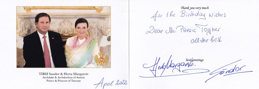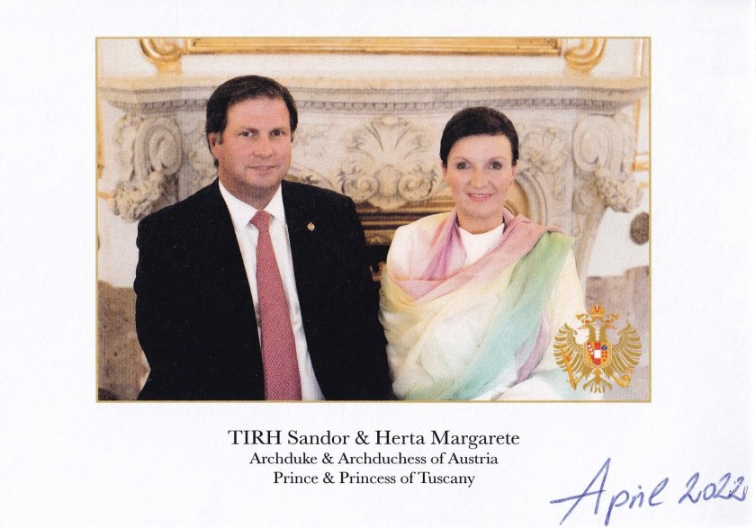 Royal Response from Their Imperial and Royal Highnesses Archduke Sandor and Archduchess Herta Margarete of Austria, Prince and Princess of Tuscany, Royal Prince and Princess of Hungry, Croatia and Bohemia on the occasion of their 57th and 61st birthdays.