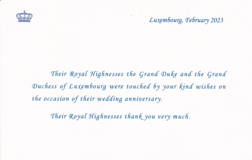Royal response from Their Royal Highnesses The Grand Duke and Grand Duchess of Luxembourg on the occasion of their 42nd wedding anniversary.