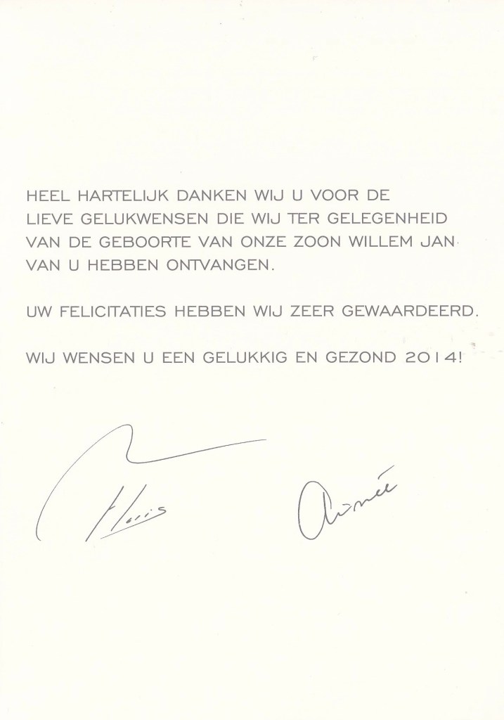 Royal response from Their Highnesses Prince Floris and Princess Aimée of Orange-Nassau, van Vollenhoven on the birth of their son Willem Jan van Vollenhoven.