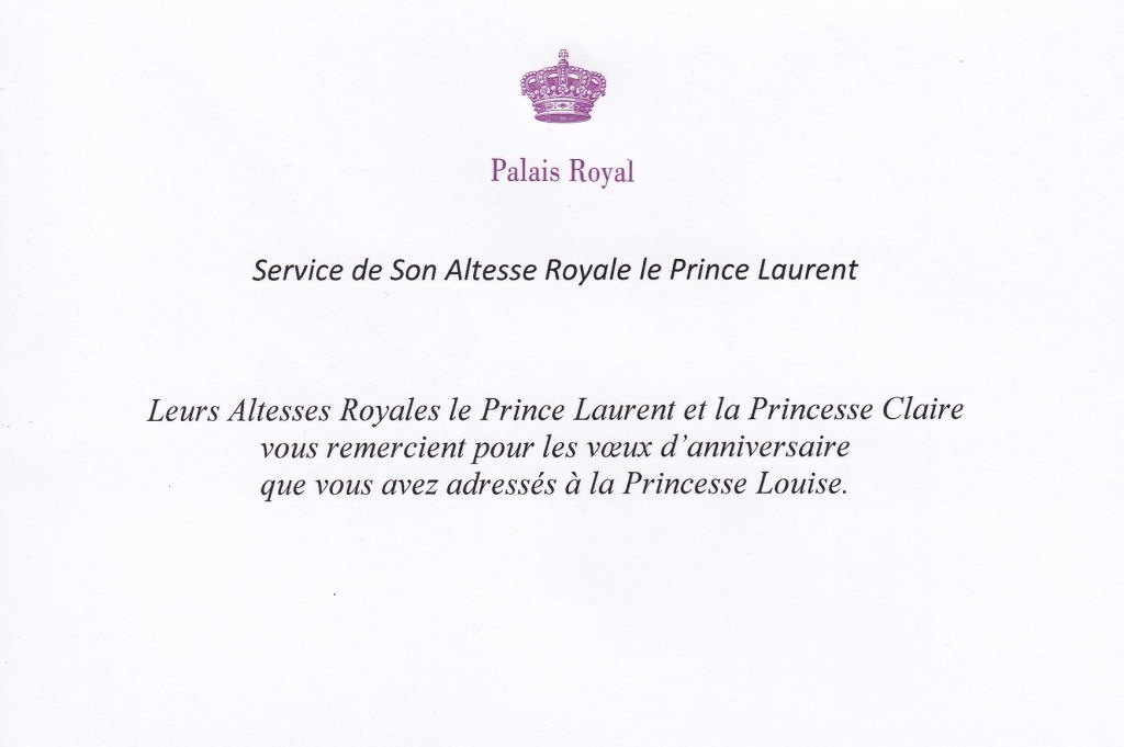 Royal response from Their Royal Highnesses Prince Laurent and Princess Claire of Belgium on the occasion of their daughter Her Royal Highness Princess Louise of Belgium’s 19th birthday.