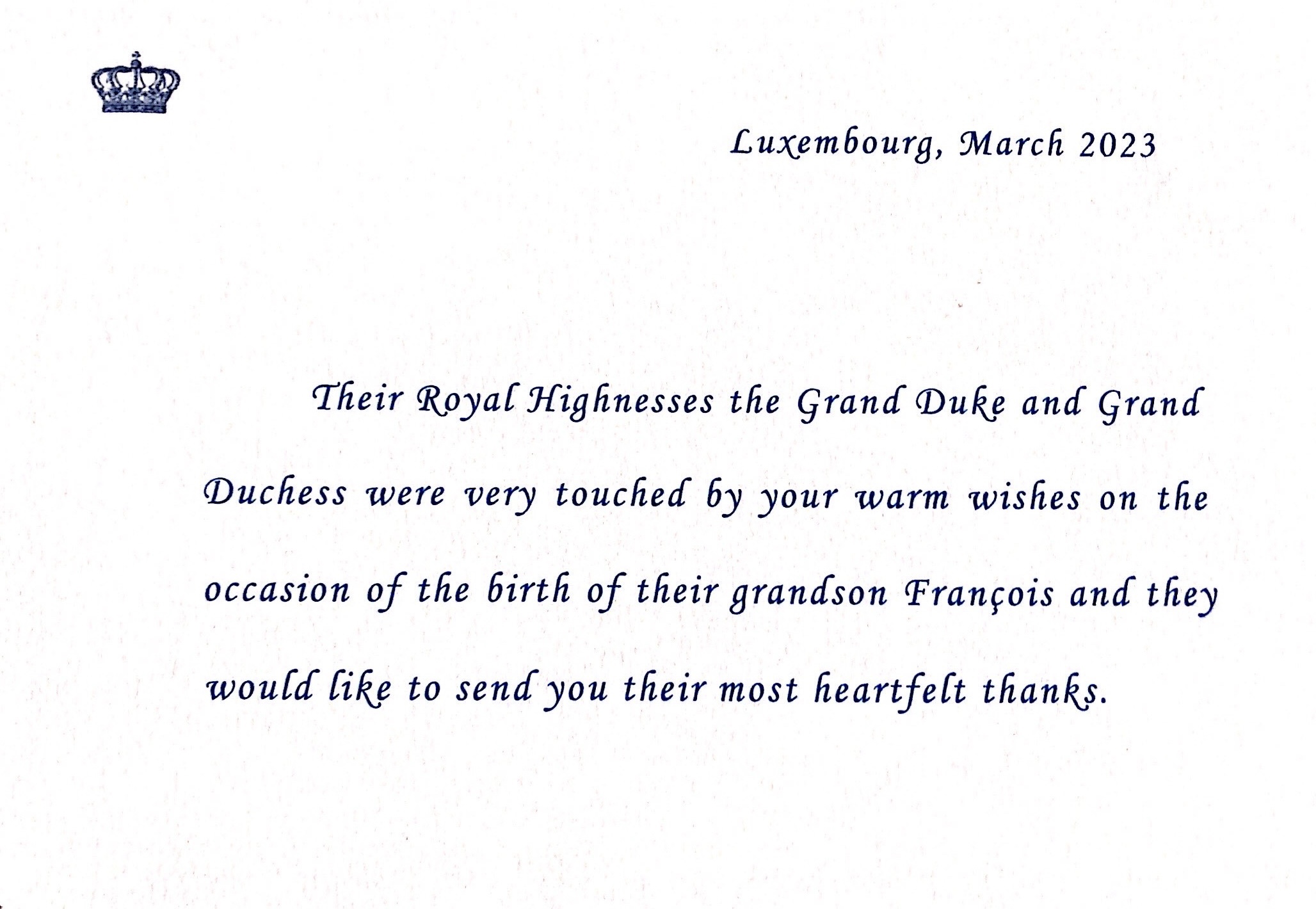Royal response from Their Royal Highnesses The Grand Duke and Grand Duchess of Luxembourg on the birth of their grandson His Royal Highness Prince François of Luxembourg.
