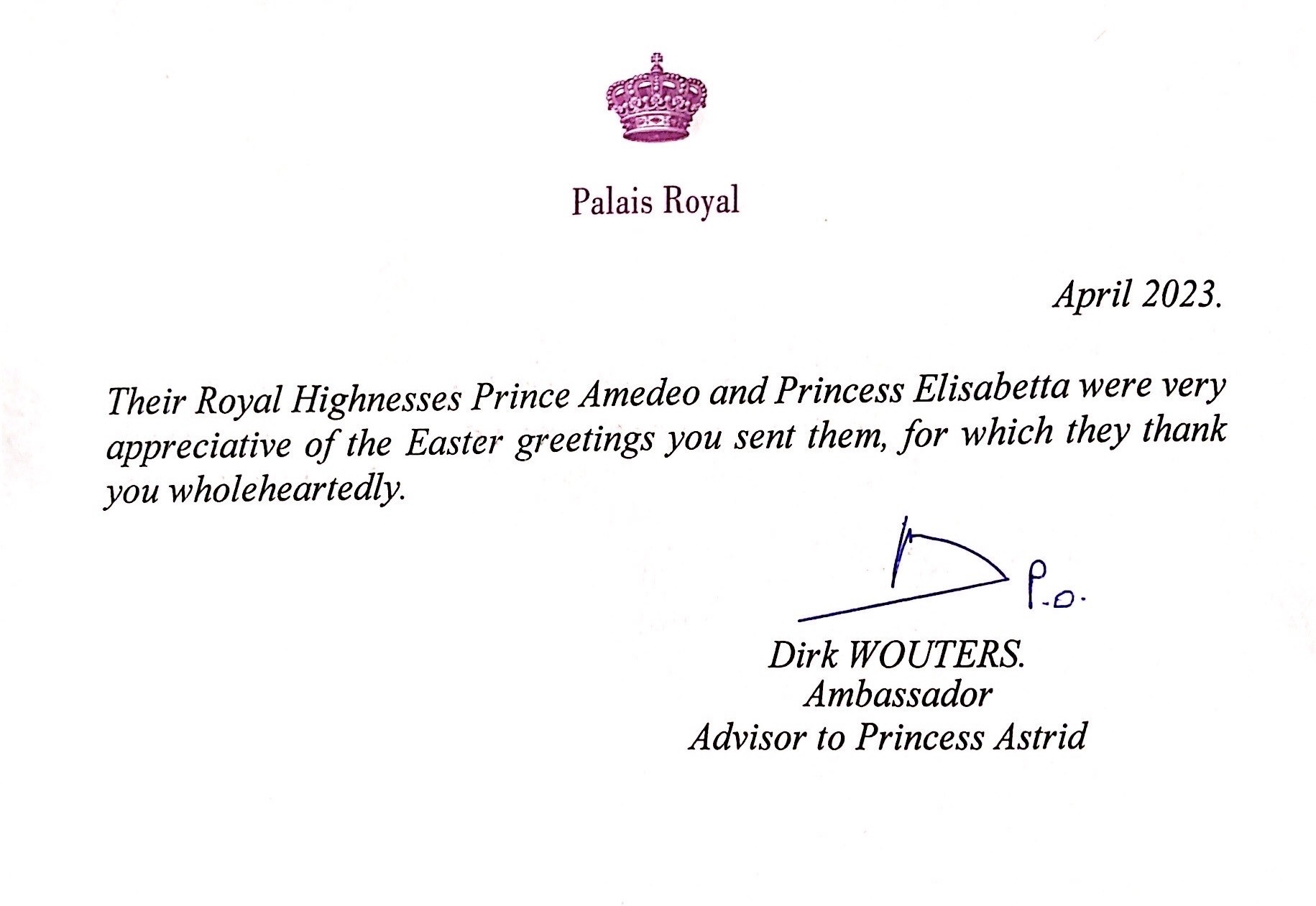 Royal response from Their Imperial and Royal Highnesses Prince Amedeo and Princess Elisabetta of Belgium, Archduke and Archduchess of Austria-Este on the occasion of Easter 2023.