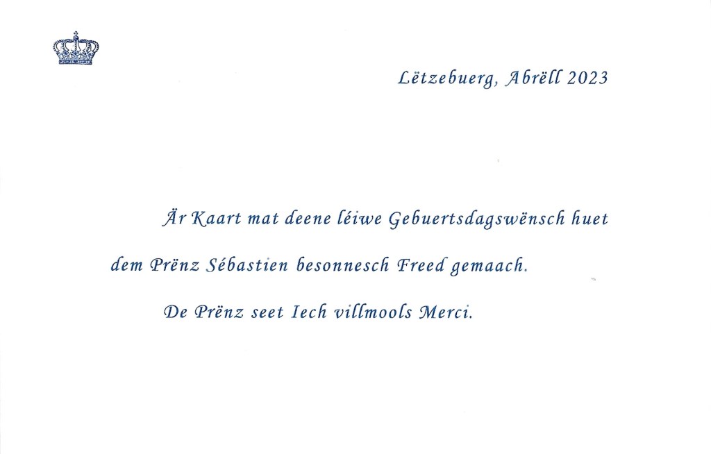 The reply is in the form of a card in Luxembourgish and also included is a picture of His Royal Highness by Sophie Margue.