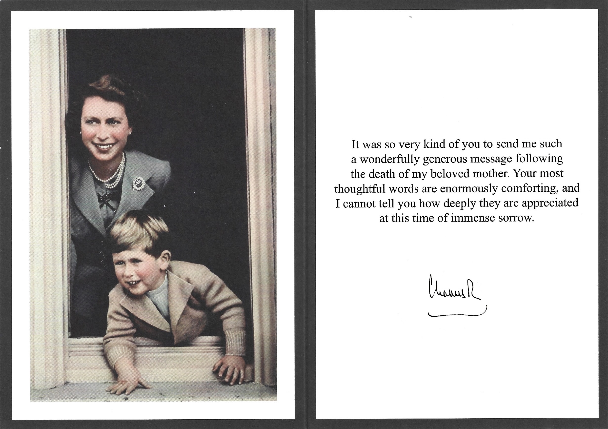 The reply is in the form of a card which on the front has His Majesty The King’s Royal Cypher and inside is a picture of His Majesty as a child with Her Majesty The late Queen taken on day 2 of Royal Ascot on 19th June 2013 by Lisa Sheridan and opposite is a message from His Majesty with his auto penned signature.