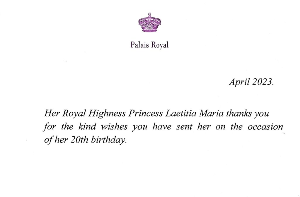 Royal response from Her Imperial and Royal Highness Princess Laetitia Maria of Belgium, Archduchess of Austria-Este on the occasion of her 20th birthday.