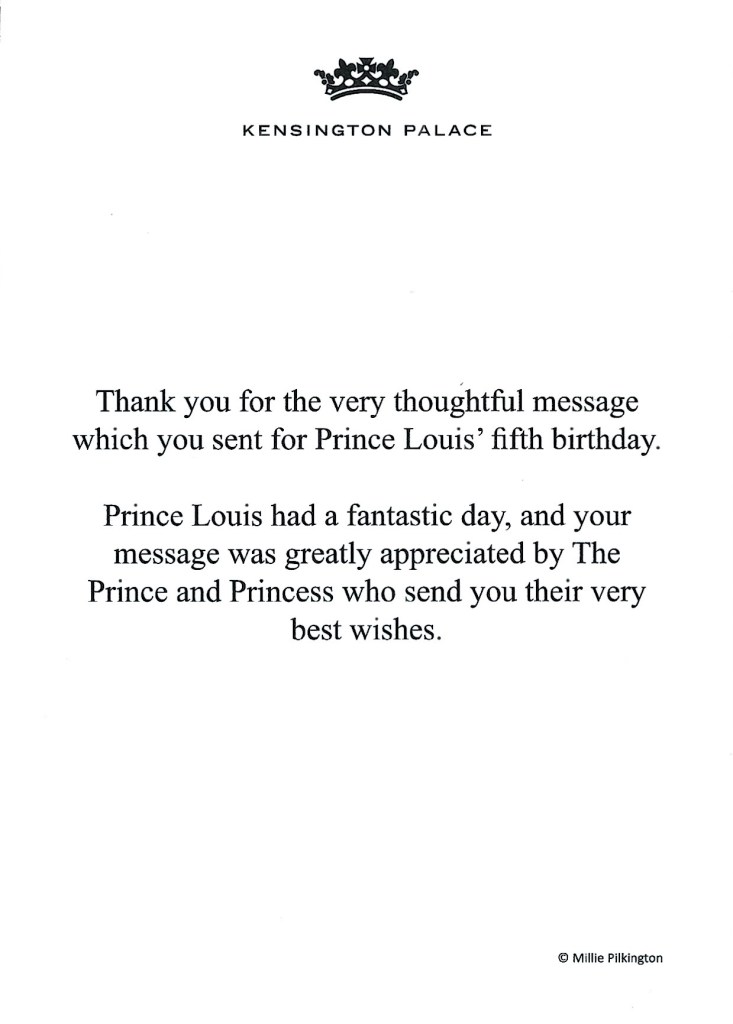 The reply is in the form of a card which on the front features a picture of His Royal Highness taken by Millie Pilkington which was released for his 5th birthday and on the reverse features a message thanking me for my birthday wishes to His Royal Highness.