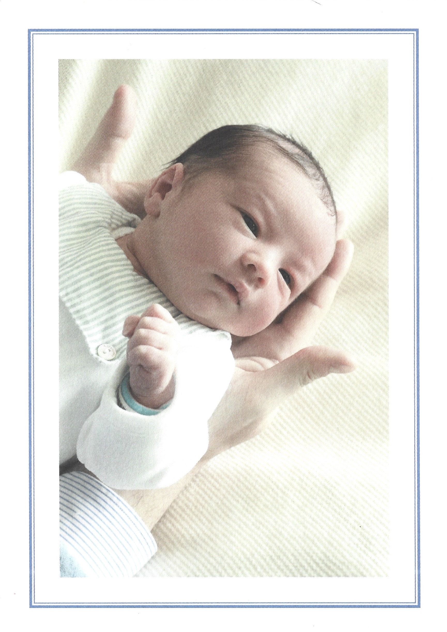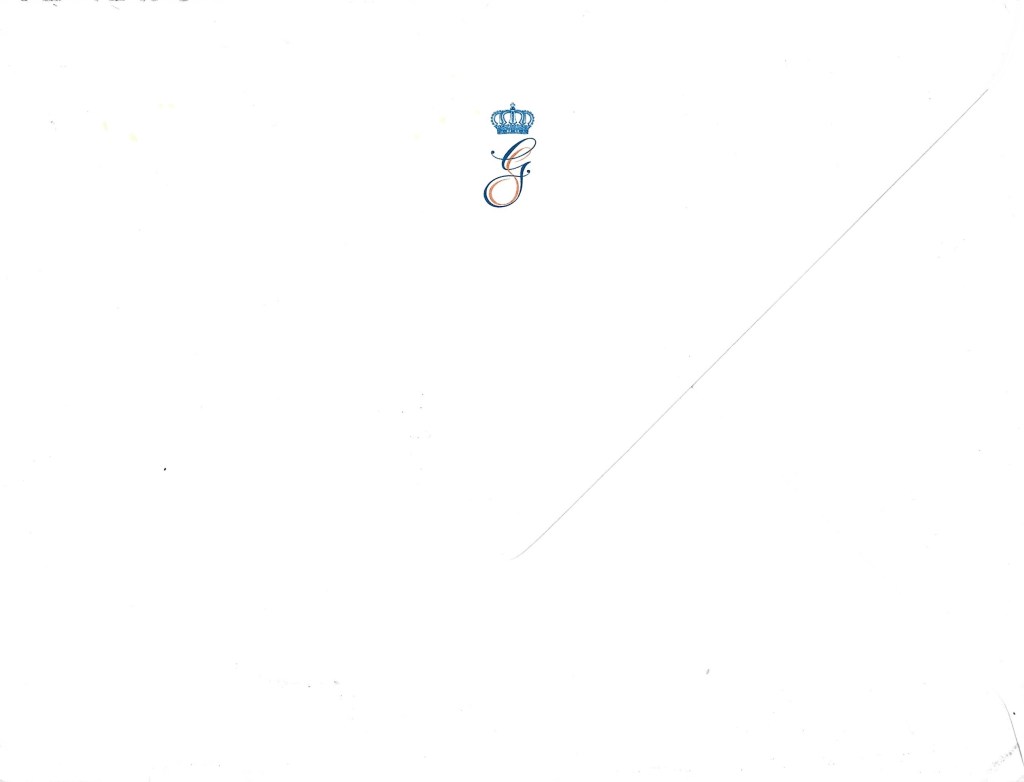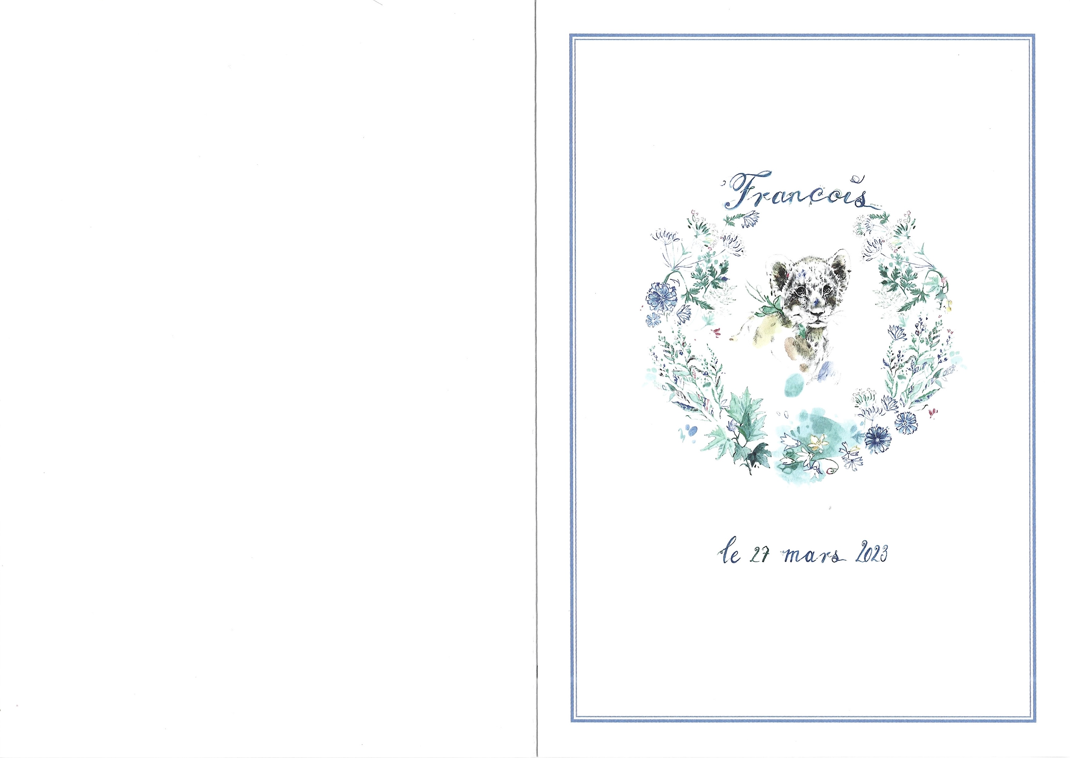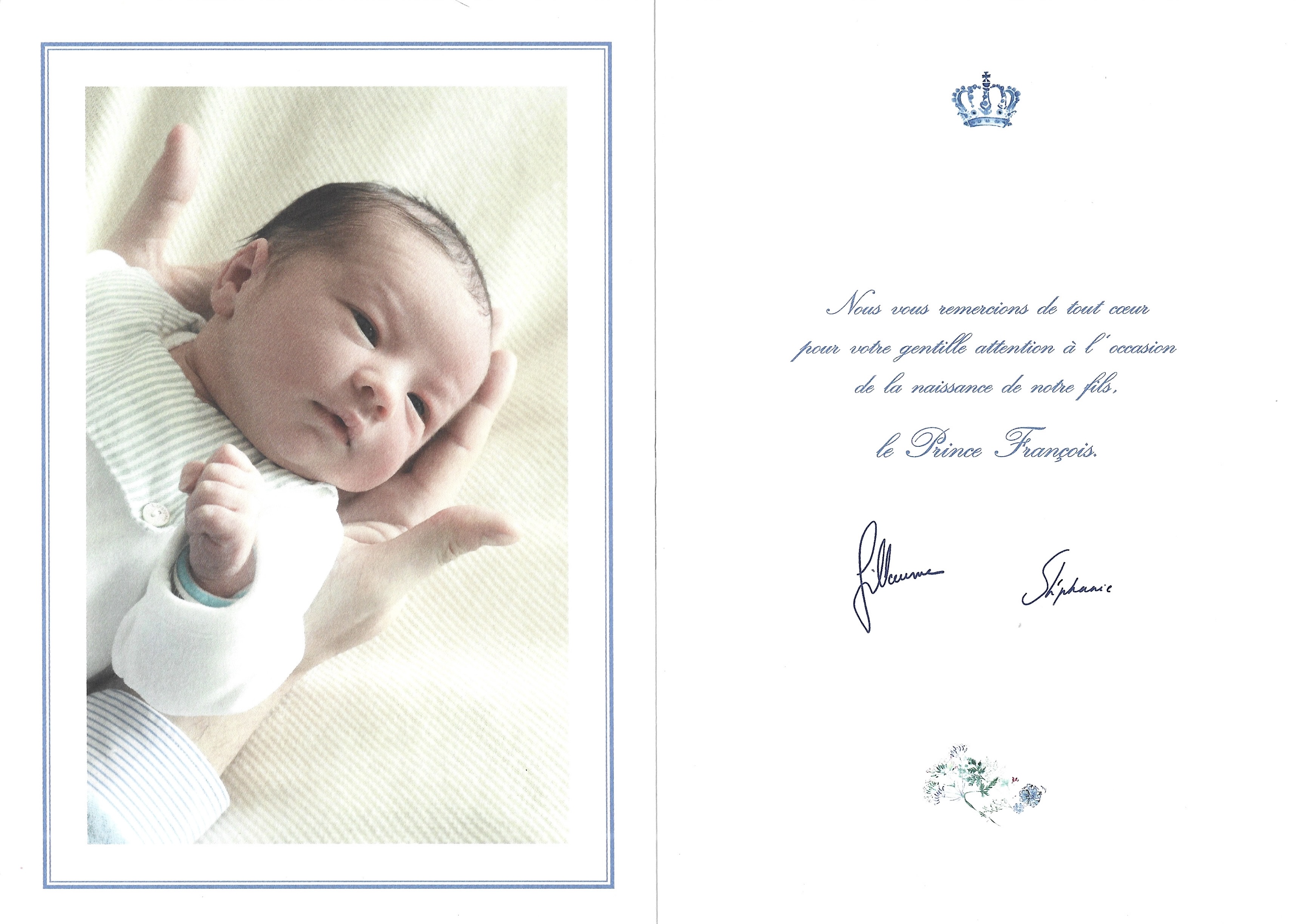 The reply is in the form of a card which on the front has François over a line cub in a wreath of flowers with his date of birth, inside is a picture of His Royal Highness and opposite is a message in English thanking me for my congratulations on the birth of their son with the printed signatures of Their Royal Highnesses.