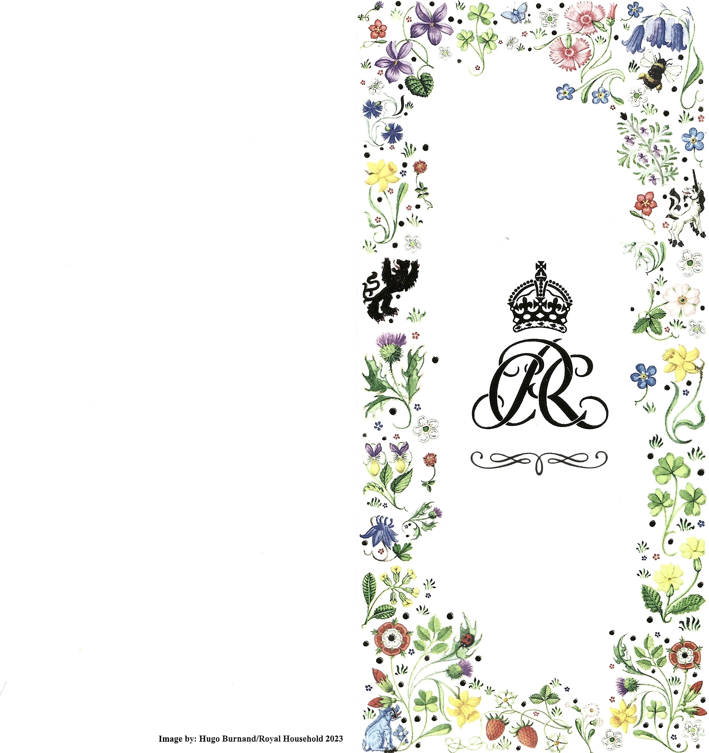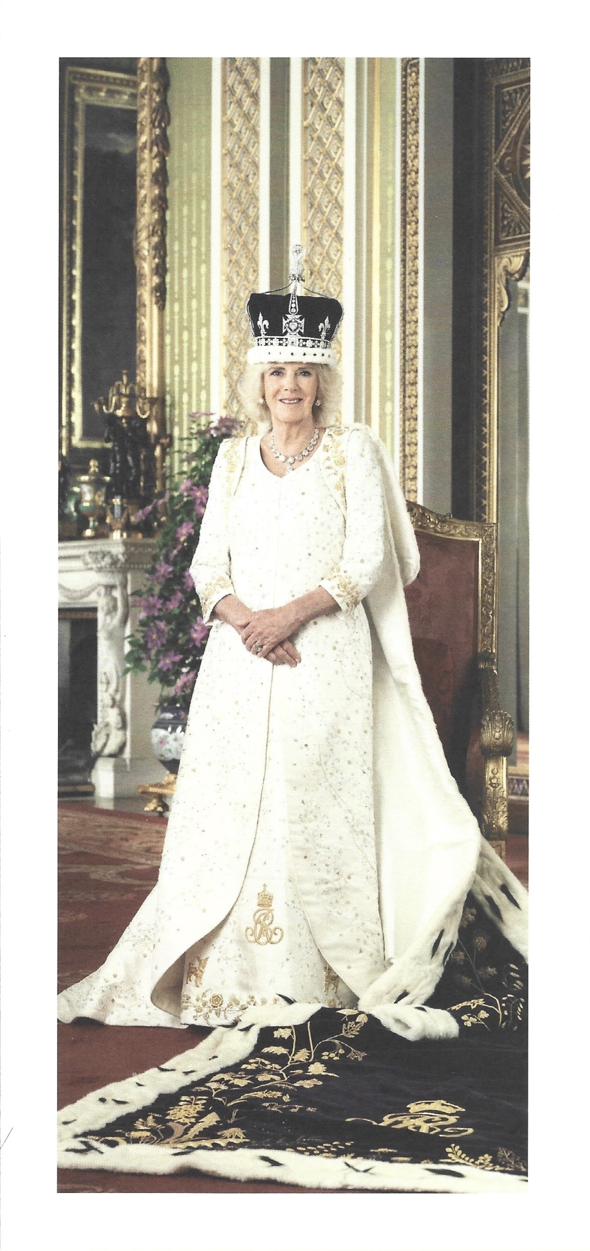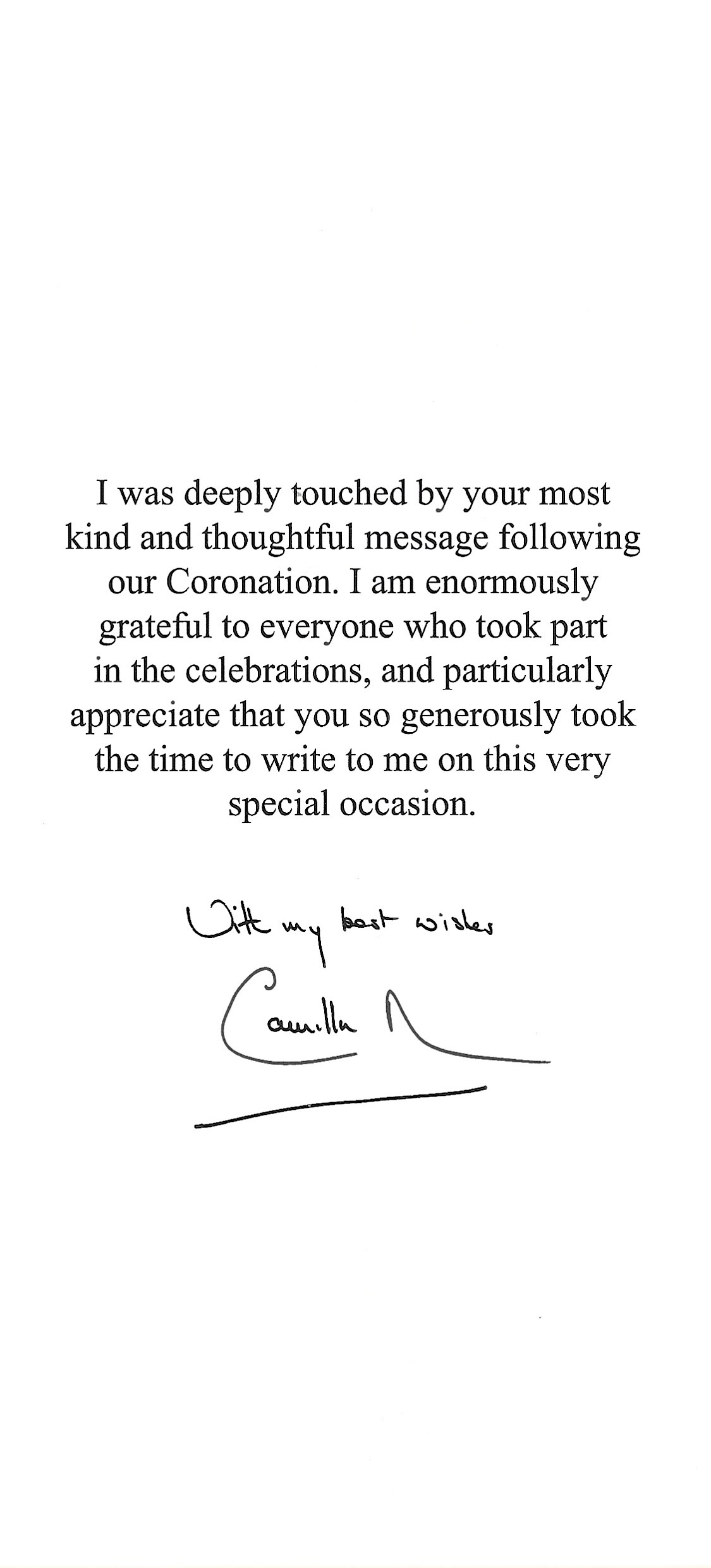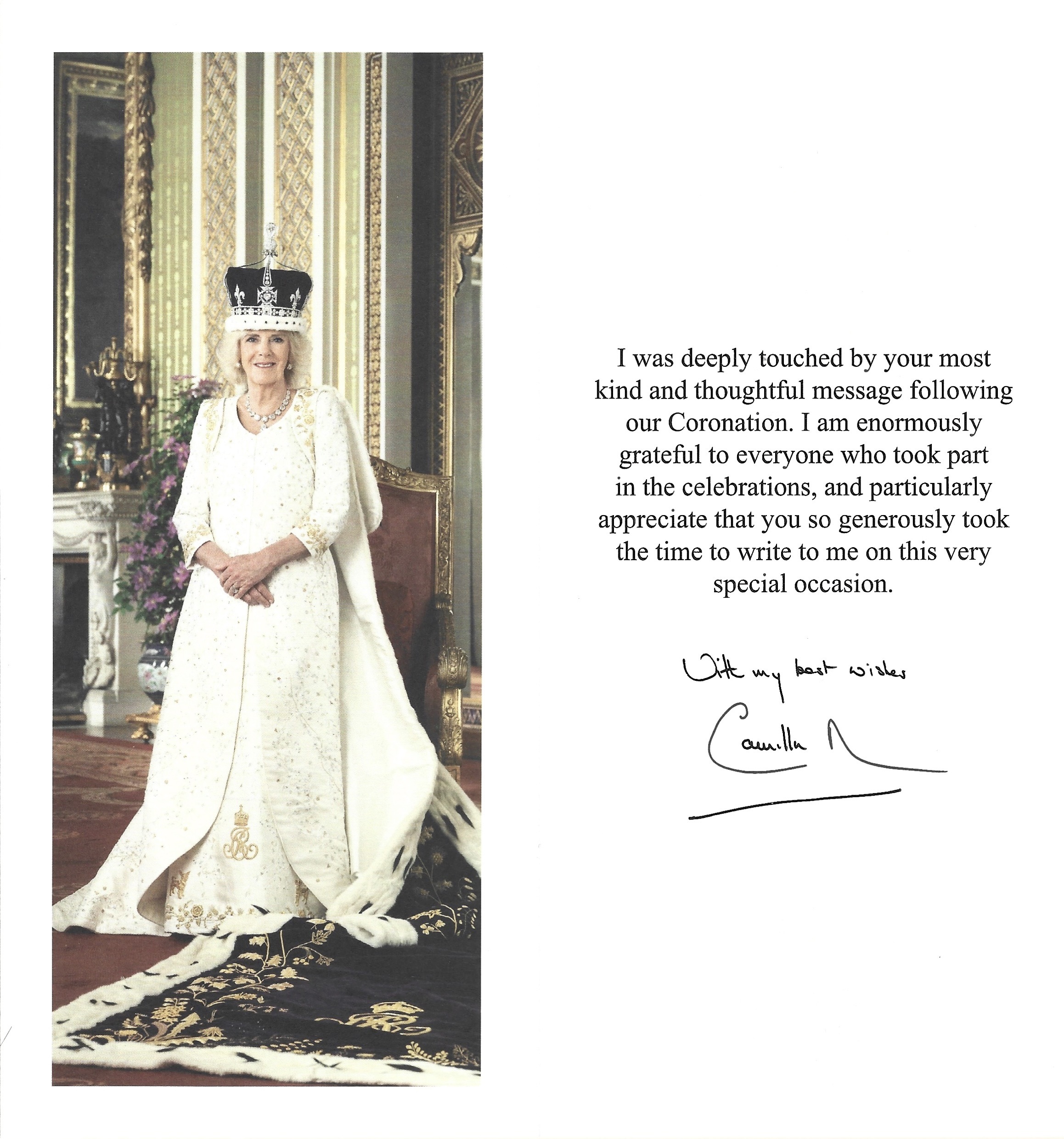 The reply is in the form of a card which on the front has the joint cypher of Their Majesties surrounded by Art created for The Coronation, inside is a picture of Her Majesty The Queen taken by Hugo Burnand at Buckingham Palace, Her Majesty Is dressed in a gown created by Bruce Oldfield which features Her Cypher, a pair of dogs, her grandchildren names and the floral emblems of The United Kingdom, she is also wearing her new robes of estate featuring her cypher, bees, a bettle and various plants and flowers. She is also wearing Queen Mary’s Crown which was made in 1911 for the coronation of Queen Mary of Teck wife of George V. Opposite is a message thanking me for wishes and has the printed signature of Her Majesty.
