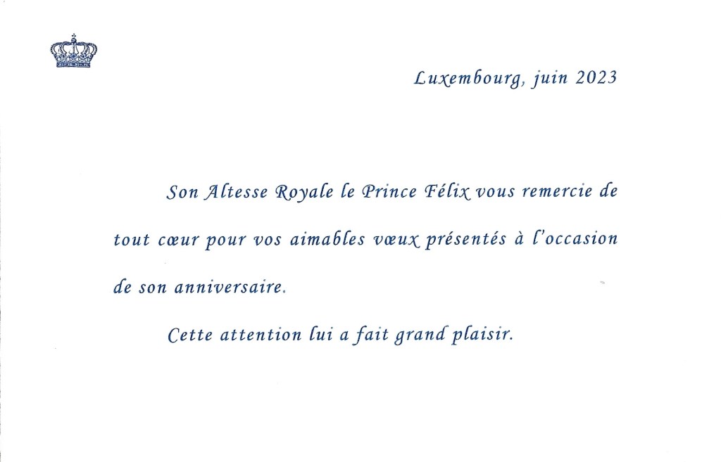 Royal response from His Royal Highness Prince Félix of Luxembourg on the occasion of his 39th birthday.