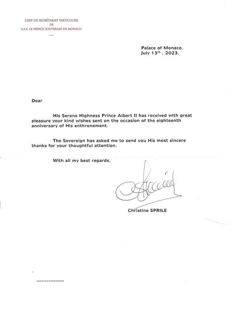 Royal response from His Serene Highness The Prince of Monaco on the 18th anniversary of his accession to The Throne of Monaco.