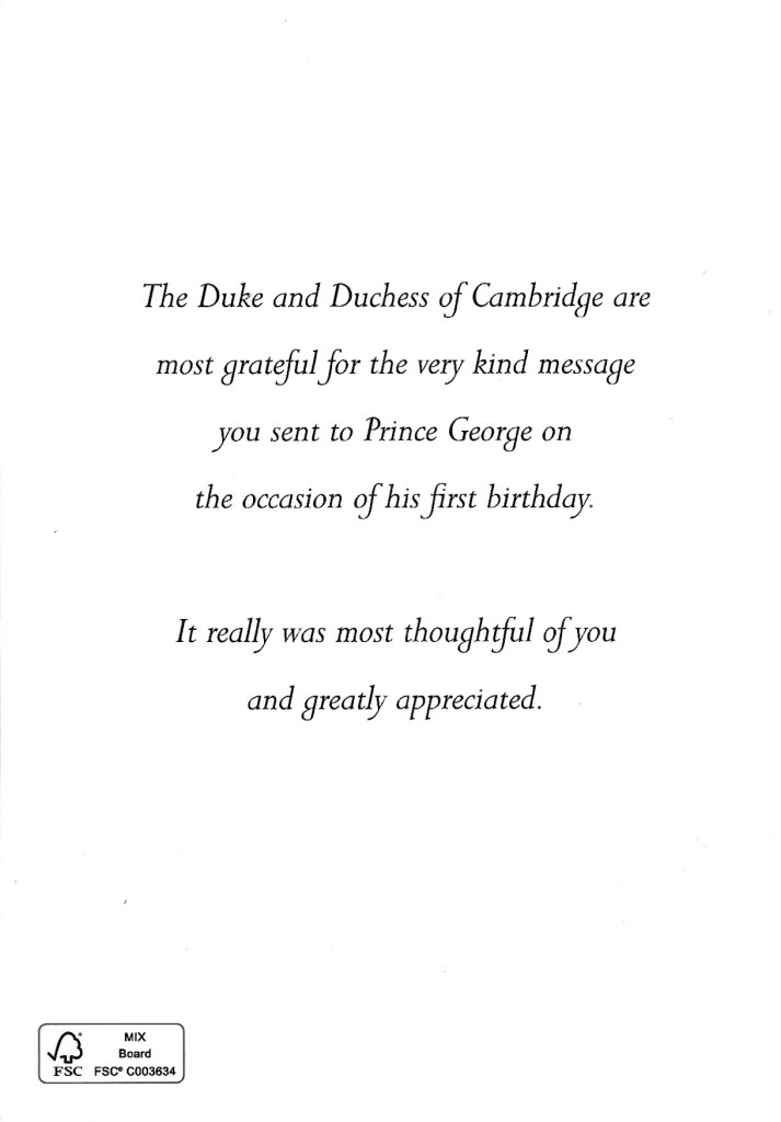 The reply in in the form of a two sided card; the front bears a picture of Their Royal Highnesses The Duke and Duchess of Cambridge with Prince George of Cambridge and the back has a message from The Duke and Duchess thanking me for my birthday wishes.