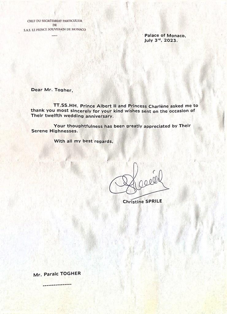 Their are two separate replies; from Their Serene Highnesses I received of a letter in English thanking me for my wishes on their 12th wedding anniversary and also included were two photos one of the couple and one of the family.