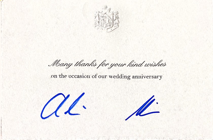 The reply is in the form of a card in English and thanks me for my wishes on their wedding anniversary and is hand signed by the couple.
