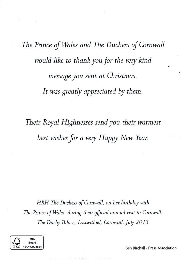 The reply features a picture of Their Royal Highnesses taken on July 17th at The Duchy Palace, Lostwitchiel, Cornwall during their annual official visit to Cornwall and on the reverse is a message thanking me for my Christmas wishes and wish me the best for the New Year.