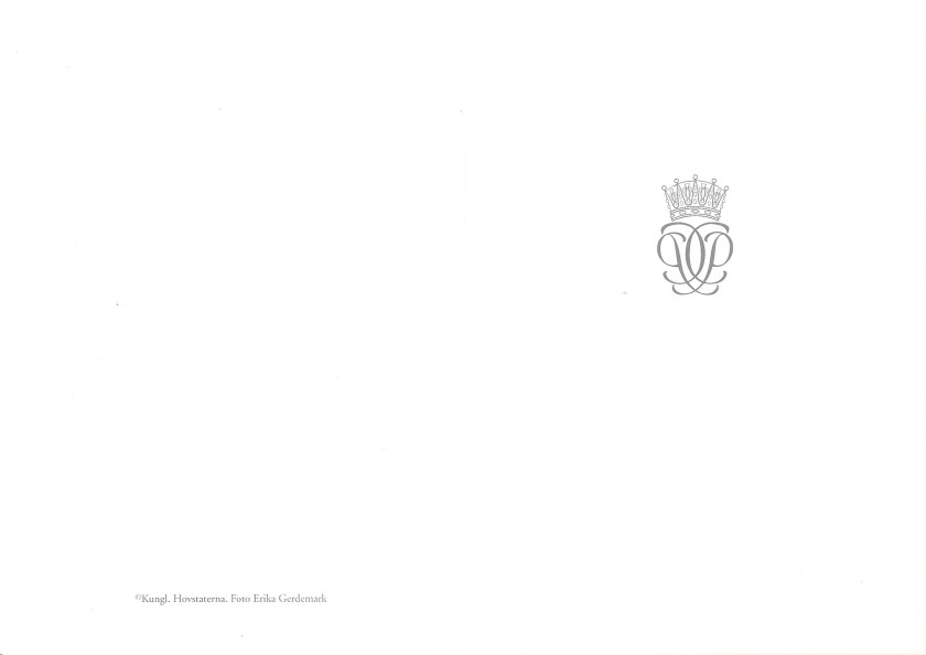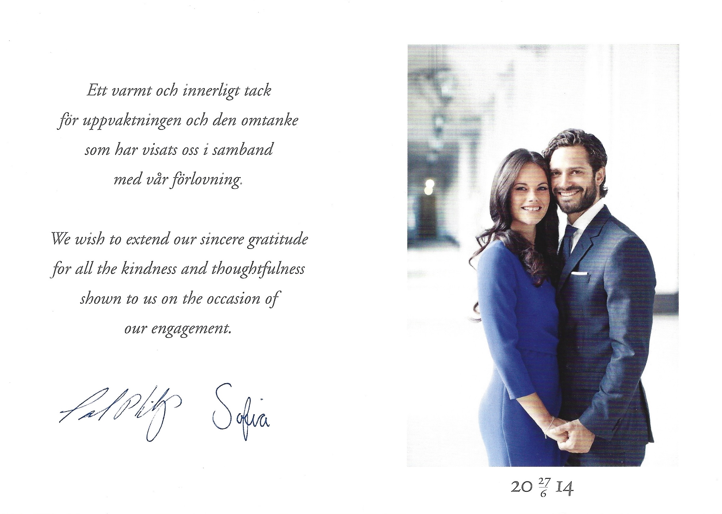 The reply is in the form of a card which on the front has The Royal Cypher of His Royal Highness, inside is a message in Swedish and English with the printed signatures of His Royal Highness and Sofia Hellqvist, opposite is a picture of the couple taken by Erika Gerdemark and under it is the date of their engagement.