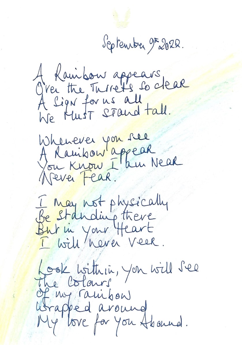 The reply is in the form of a card which on the front has a poem written by Sarah, Duchess of York on the oassing of Her Majesty.