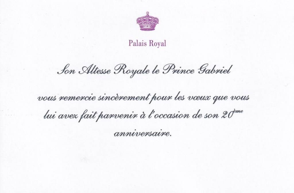 Royal response from His Royal Highness Prince Gabriel of Belgium on the occasion of his 20th birthday.