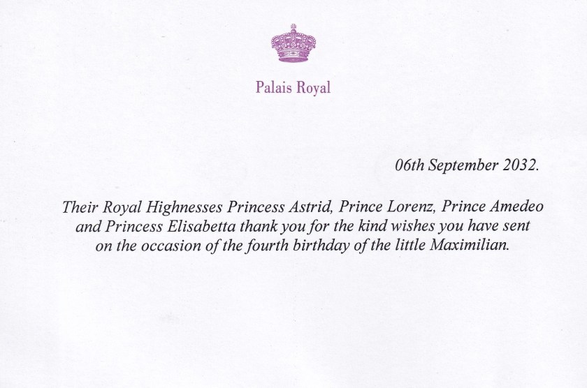 Royal response from Their Imperial and Royal Highnesses Prince Lorenz and Princess Astrid of Belgium The Archduke and Archduchess of Austria-Este and Prince Amedeo and Princess Elisabetta of Belgium, Archduke and Archduchess of Austria-este on the occasion of His Imperial and Royal Highness Archduke Maximilian of Austria-Este’s 4th birthday.