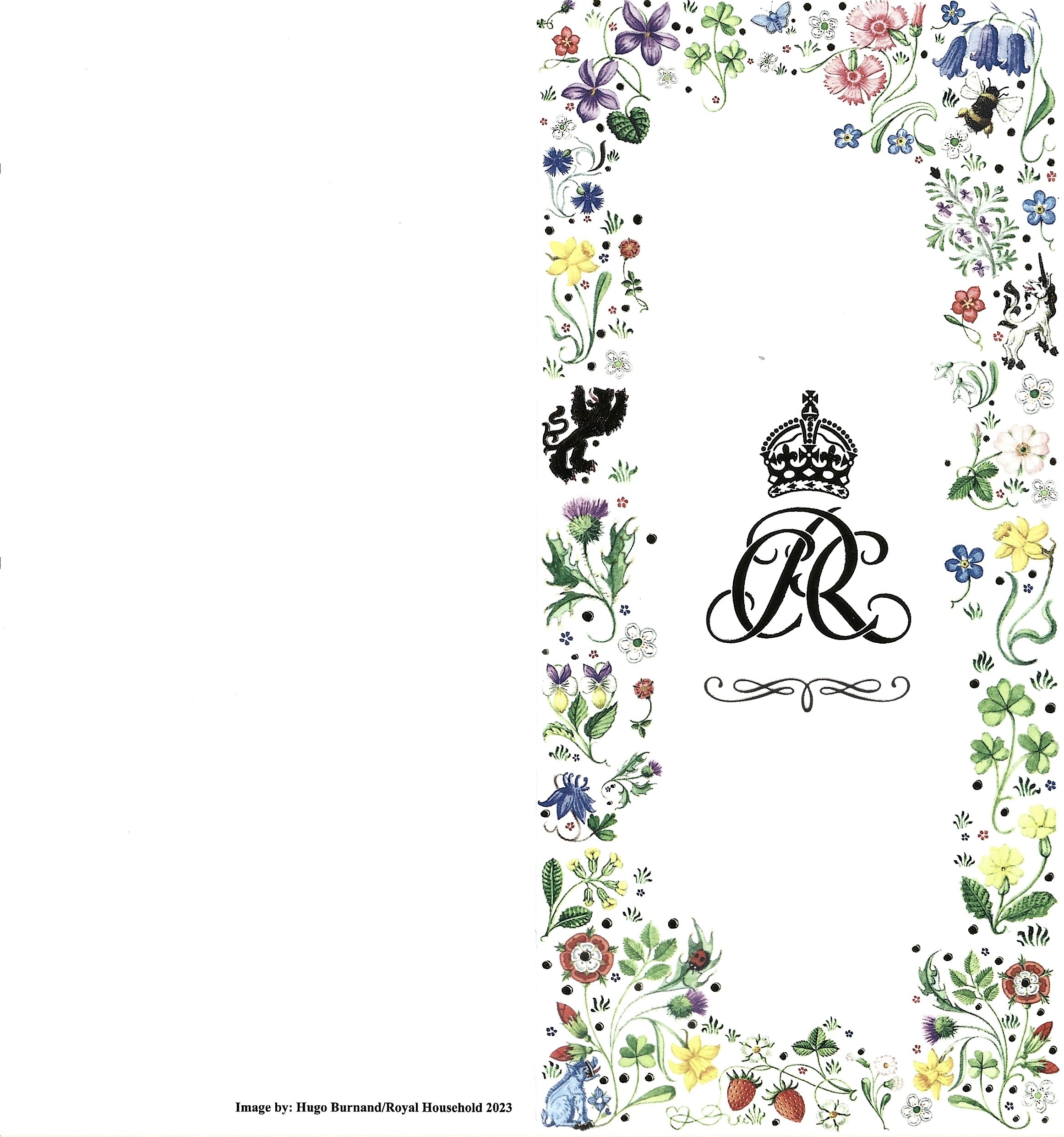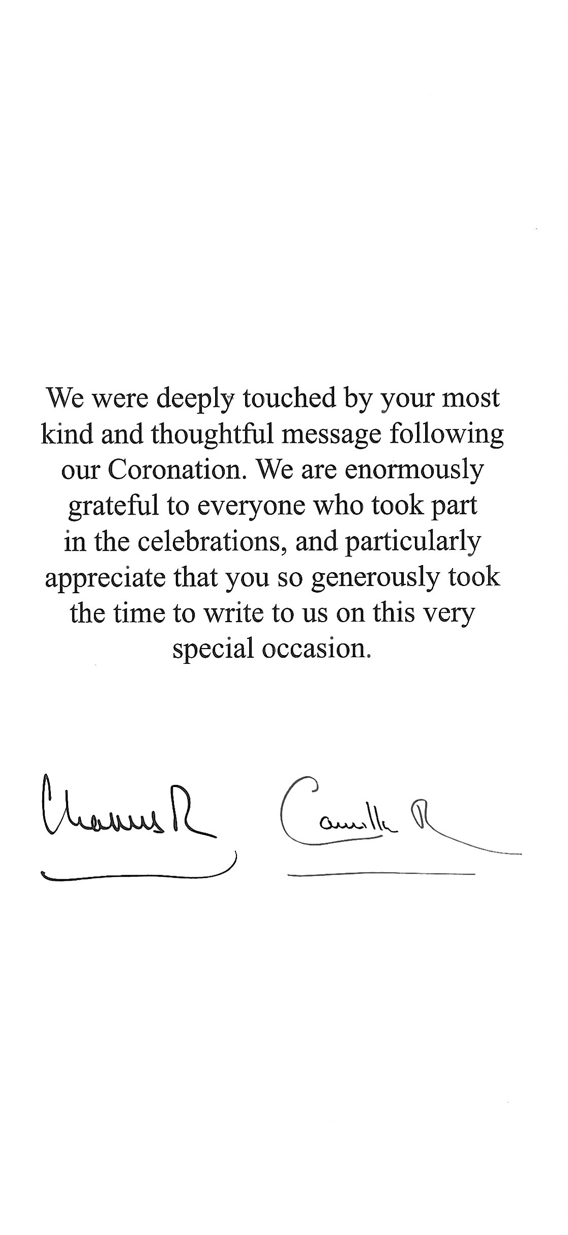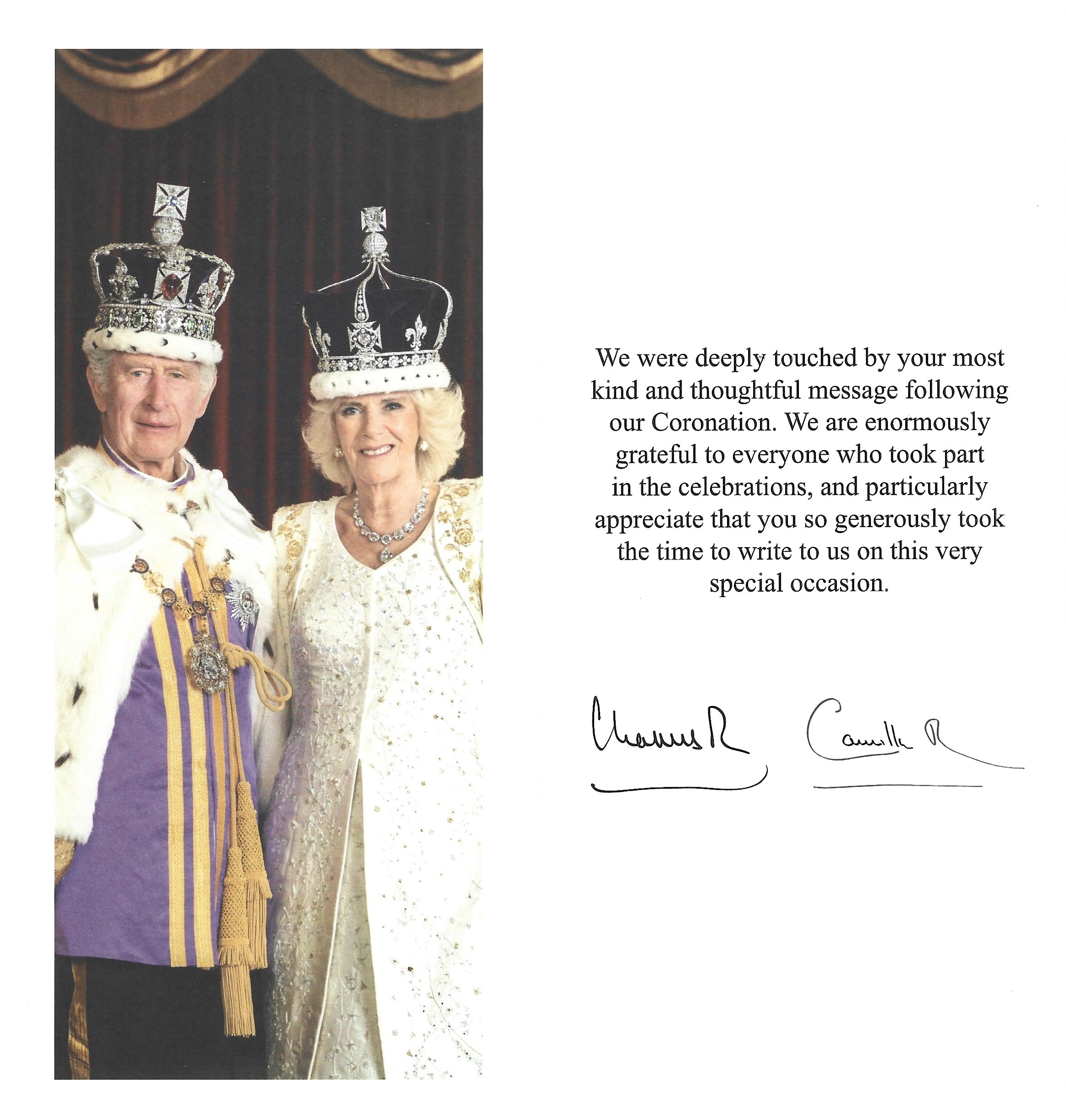The reply is in the form of a card which on the front has the joint cypher of Their Majesties surrounded by Art created for The Coronation, inside is a picture of Their Majesties taken by Hugo Burnand at Buckingham Palace, His Majesty is wearing The Robe of Estate which belonged to George VI worn in 1937 at his coronation, he also wore a Purple Coronation Tunic and The Imperial State Crown; Her Majesty Is dressed in a gown created by Bruce Oldfield which features Her Cypher, a pair of dogs, her grandchildren names and the floral emblems of The United Kingdom, she is also wearing her new robes of estate featuring her cypher, bees, a bettle and various plants and flowers. She is also wearing Queen Mary’s Crown which was made in 1911 for the coronation of Queen Mary of Teck wife of George V. Opposite is a message thanking me for wishes and has the printed signatures of Their Majesties.