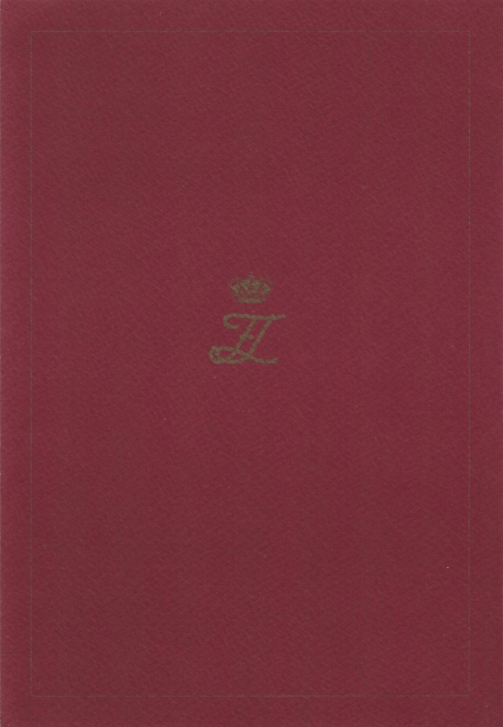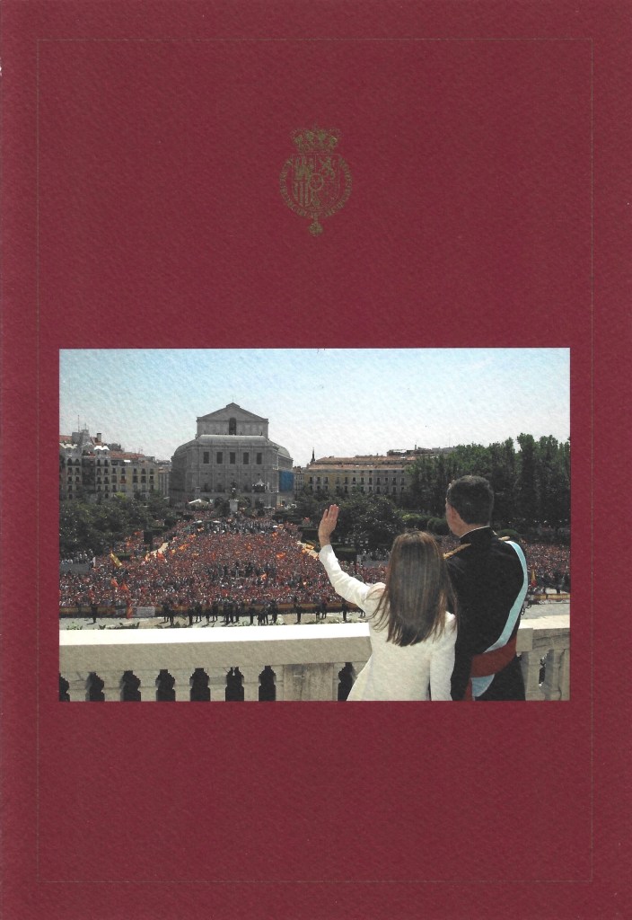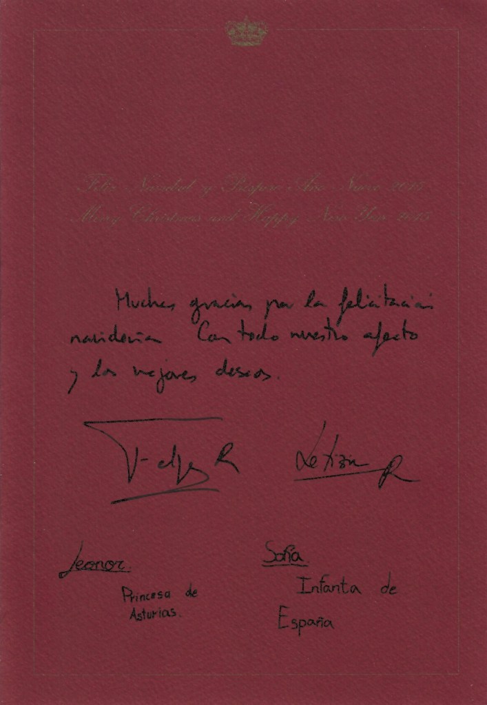 The reply is in the form of a red card bearing The Royal Crest on the front of the card above a picture of Their Majesties onn the Balcony of Zarzuela Palace after The Crowing of Felipe Vi as King of Spain and Their Majesty’s joint monogram on the reverse side. Inside is a picture of Their Majesties with their children Their Royal Highnesses The Princess de Asturias and Infanta Sofía of Spain. It also bears a message on the other side thanking me for my Christmas wishes and wishing me the best. It then features the printed signatures of the Spanish Royal Family.