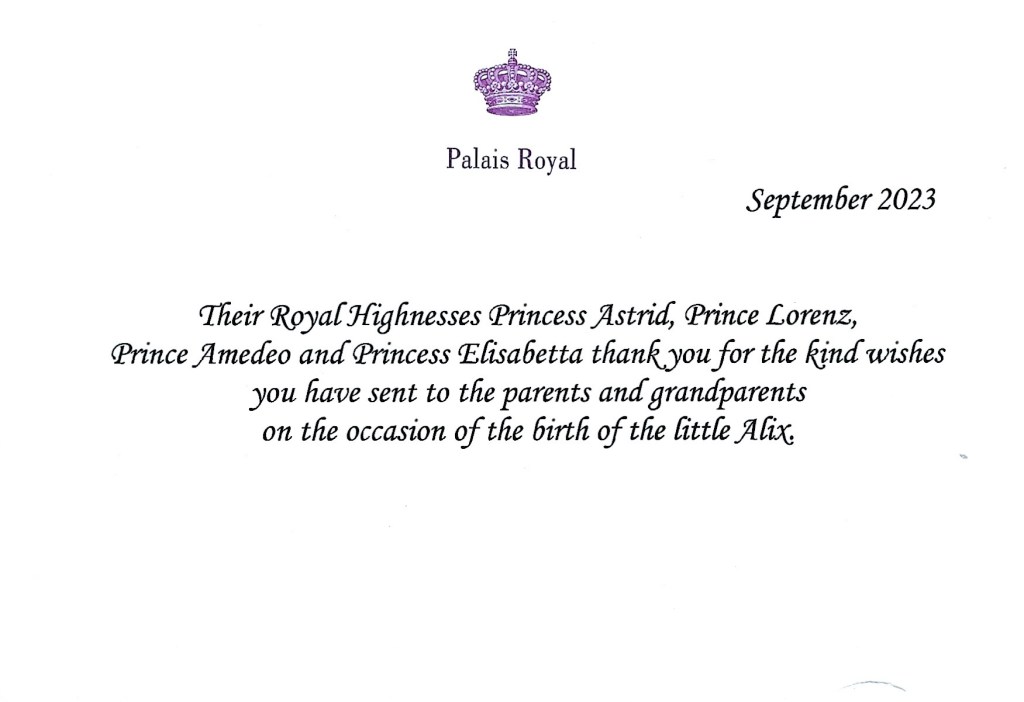 Royal response from Their Imperial and Royal Highnesses Prince Lorenz and Princess Astrid of Belgium, The Archduke and Archduchess of Austria-Este, Prince Amedeo and Princess Elisabetta of Belgium, Archduke and Archduchess of Austria-Este on the birth of their granddaughter/daughter Her Imperial and Royal Highness Archduchess Alix of Austria-Este.