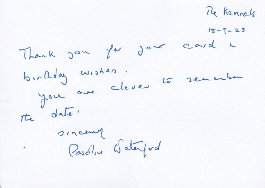 Response from The Most Honourable The Dowager Marchioness of Waterford on the occasion of her 87th Birthday.