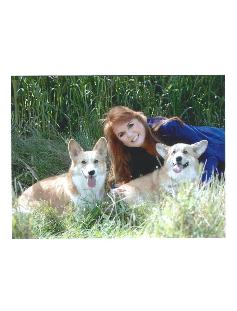 The reply is in the form a card which on the front has a picture of Sarah, Duchess of York with two corgis which previously belonged to Her Majesty Elizabeth II, The Queen and on the reverse is a printed message and the printed signature of Sarah.