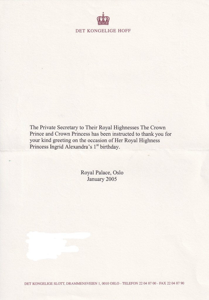 Royal response from Their Royal Highnesses The Crown Prince and Crown Princess of Norway their daughter Her Royal Highness Princess Ingrid Alexandra of Norway’s 1st birthday.