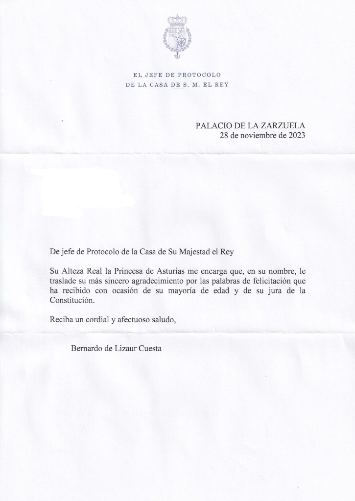 The reply is in the form of a letter in Spanish thanking me for my birthday wishes and congratulations wishes to Her Royal Highness.