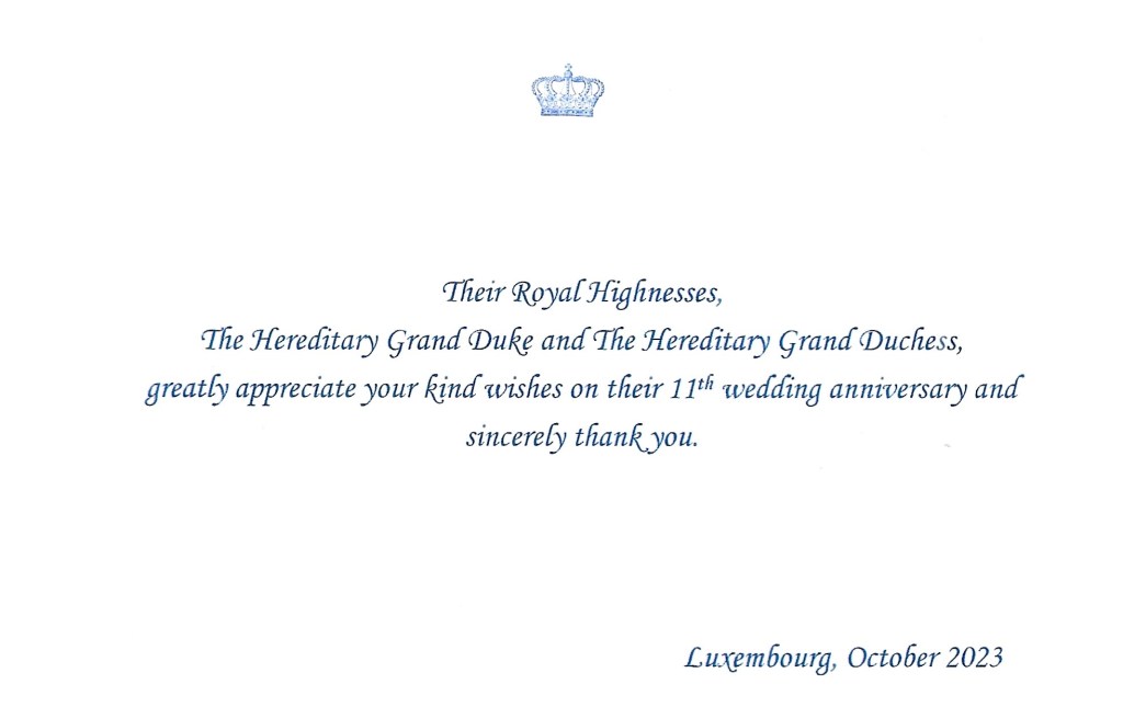 Royal response from Their Royal Highnesses The Hereditary Grand Duke and Hereditary Grand Duchess of Luxembourg on the occasion of their 11th wedding anniversary.