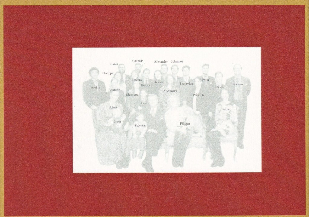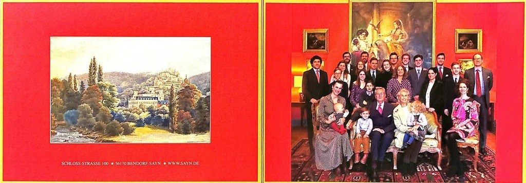 The reply is in the form of a card which on the front has a picture of The Sayn-Wittgenstein-Sayn family, on the reverse is the names of each person in the family photo, opposite is a message in german signed by Their Serene Highnesses with the names of the family forming a border and on the reverse is a painted scene featuring Schloss Sayn on the front.