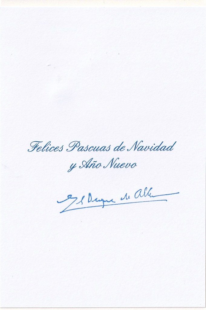 The reply is in the form of a card which on the front is a picture of a The Madonna and Child and inside is a message in Spanish and it is hand signed by The Duke.