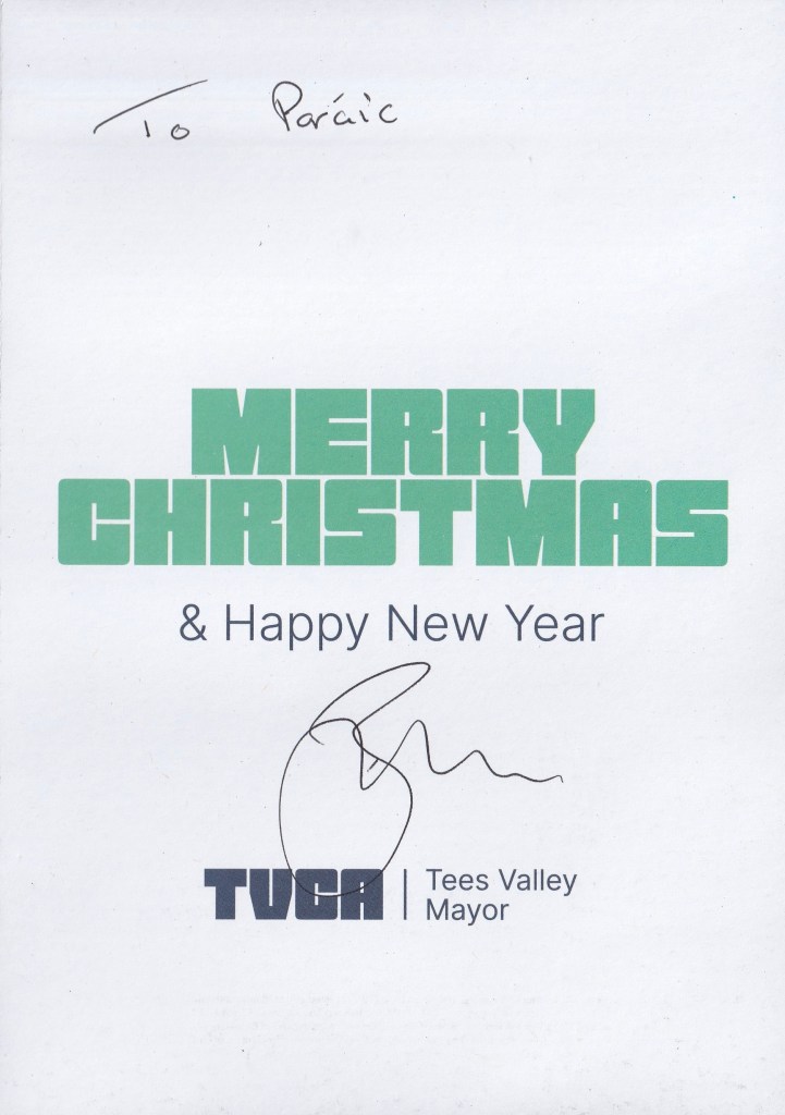 The reply is in the form of a Christmas card designed for the Tees Valley Mayor and inside is a Christmas message and is hand signed by The Baron.