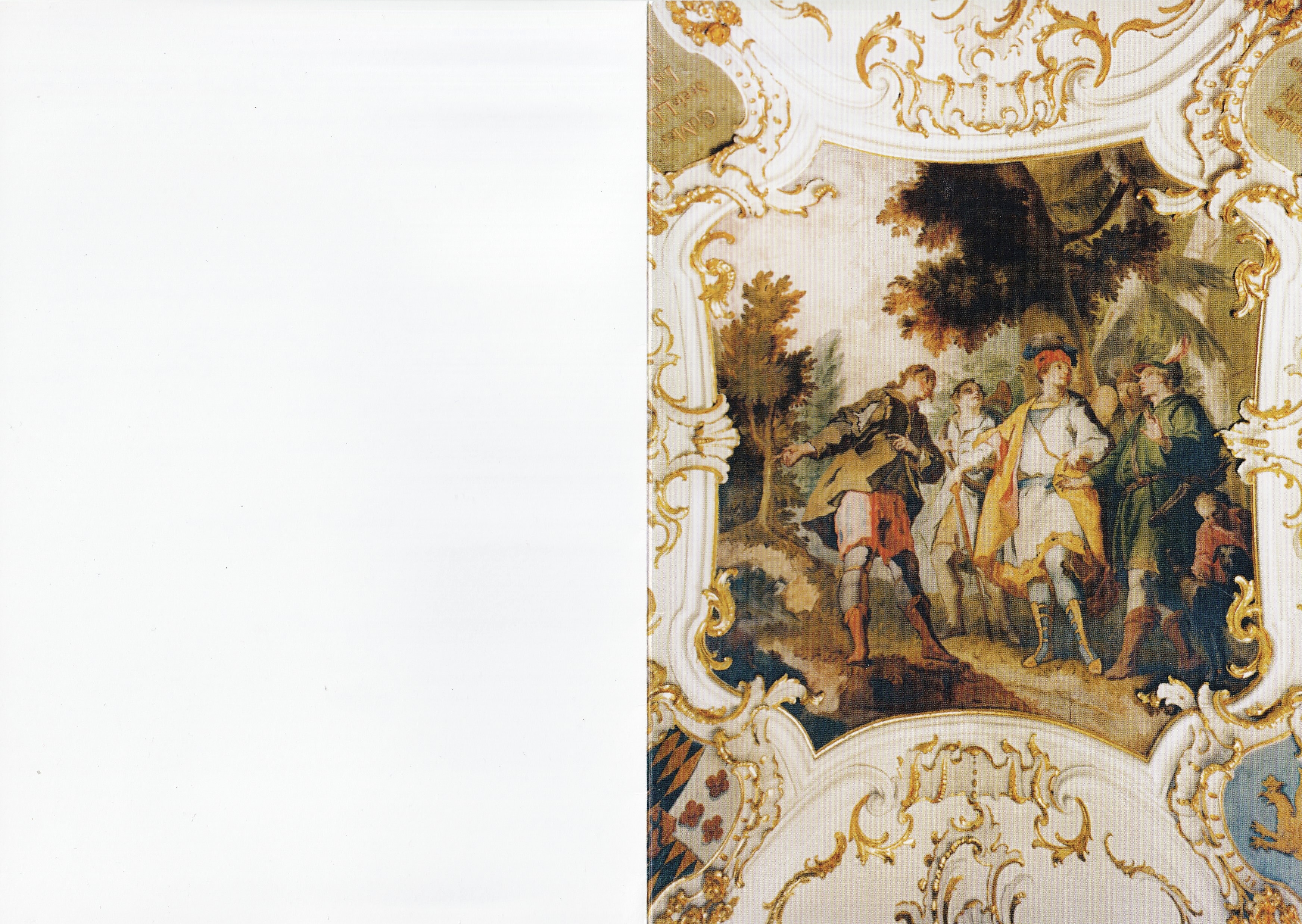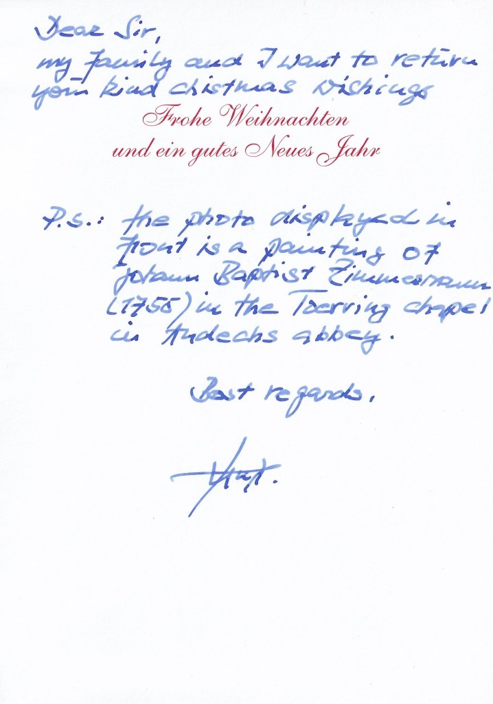 The reply is in the form of a card which on the front has a picture of a painting of the History of The Founding of Wessobrunn by Johann Baptist Zimmermann in the Toerring Chapel and inside is a printed message in German and a handwritten message in English and is hand signed.