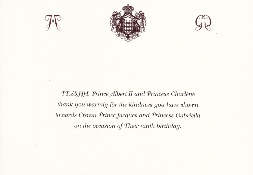 The reply is in the form of a double sided card, pme side been in English and the other in French. On top is is the Crest of The Kingdom of Monaco and The Monograms of Their Serene Highnesses Jacques, Hereditary Prince of Monaco, Marquis of Baux and Princess Gabriella, Countess of Carladès.