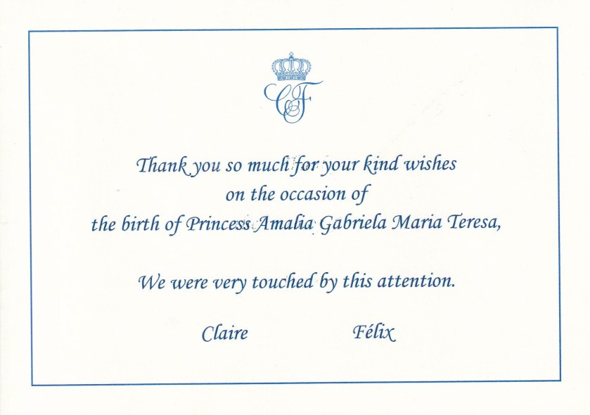 Royal response from Their Royal Highnesses Prince Felix and Princess Claire of Luxembourg on the birth of their daughter Her Royal Highness Princess Amalia de Nassau.