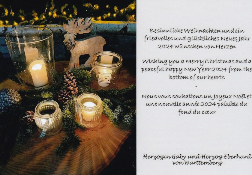 Royal response from Their Serene Highnesses Duke Eberhard and Duchess Gaby of Württemberg on the occasion of Christmas 2023 and the New Year 2024.