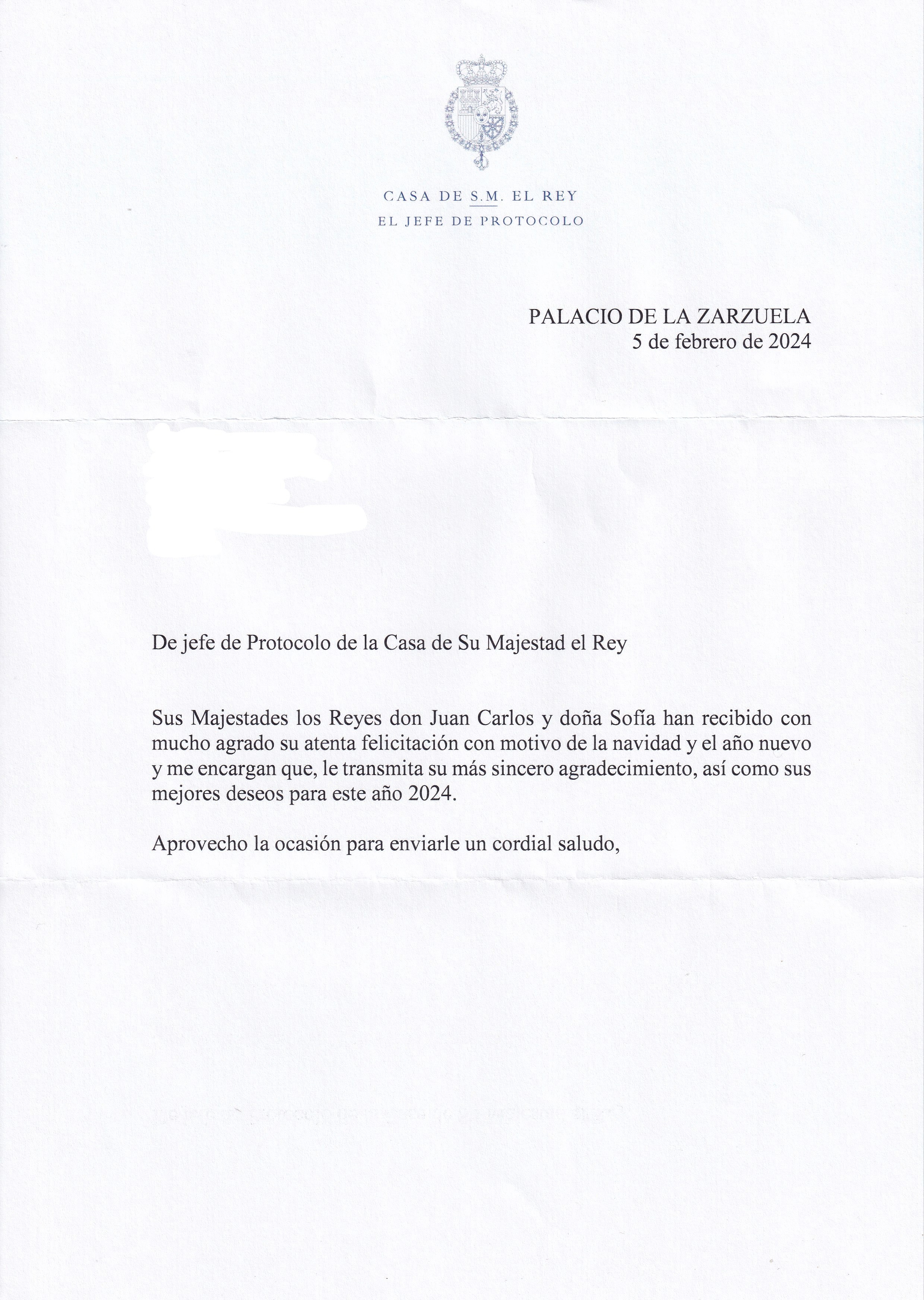 Royal response from Their Majesties King Juan Carlos I and Queen Sofia of Spain on the occasion of Christmas 2023 and the New Year 2024.