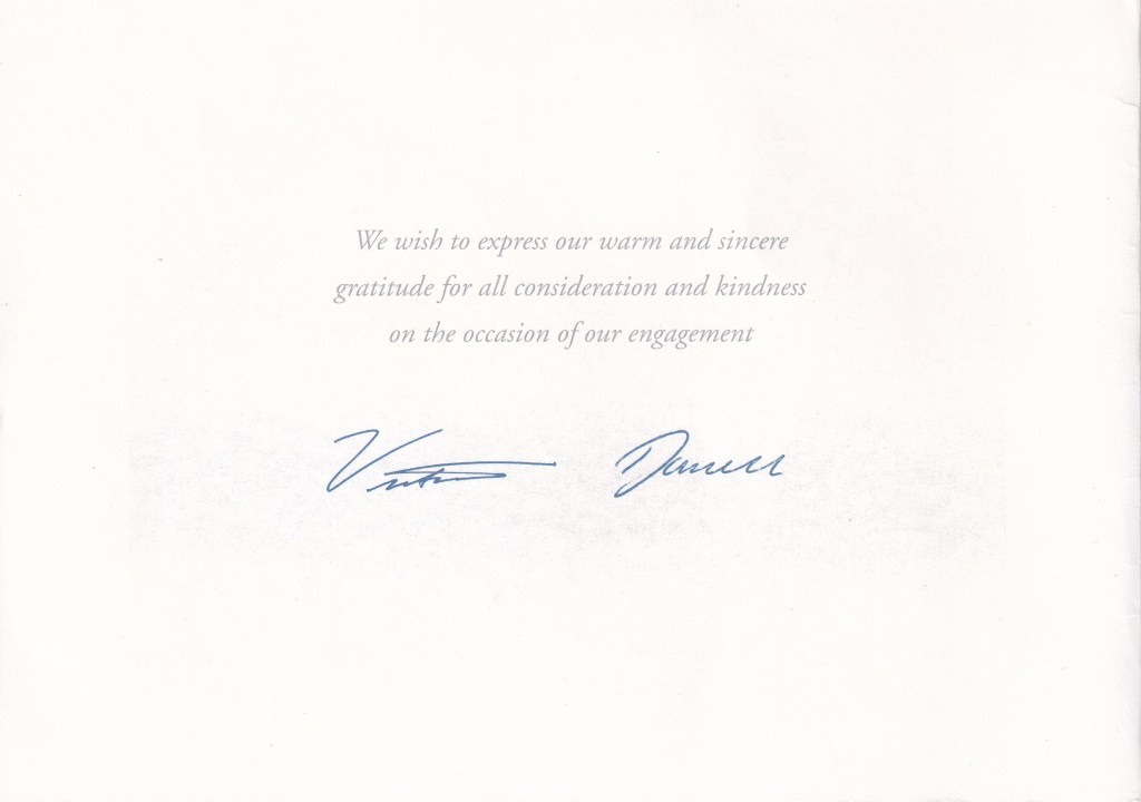 The reply is in the form of a card which on the front has Her Royal Highness Cypher, inside is a message in English and the printed signatures of the couple and opposite is a picture of the couple.