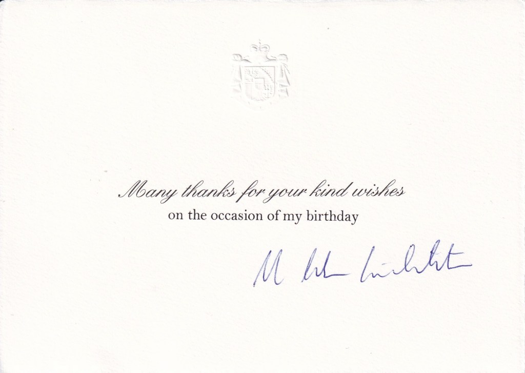 The reply is in the form of a card featuring the Royal Coat of Arms on top over a message thanking me for my birthday wishes and is signed by His Serene Highness.