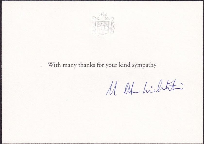 The reply is in the form of a card which has a black border and thanks me for my kind wishes of sympathy and the signature of His Serene Highnesses.
