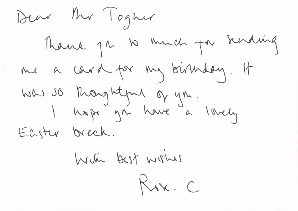 The reply is in the form of a card which has a picture of Houghton Hall on the front and on the inside is a hand written note and it is signed by Lady Cholmondeley.