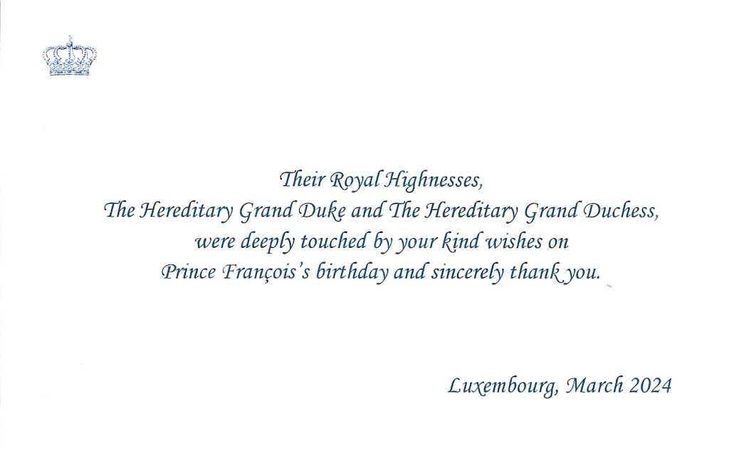 Royal response from Their Royal Highnesses The Hereditary Grand Duke and Hereditary Grand Duchess of Luxembourg on the occasion of their son His Royal Highness Prince François of Luxembourg’s 1st birthday.