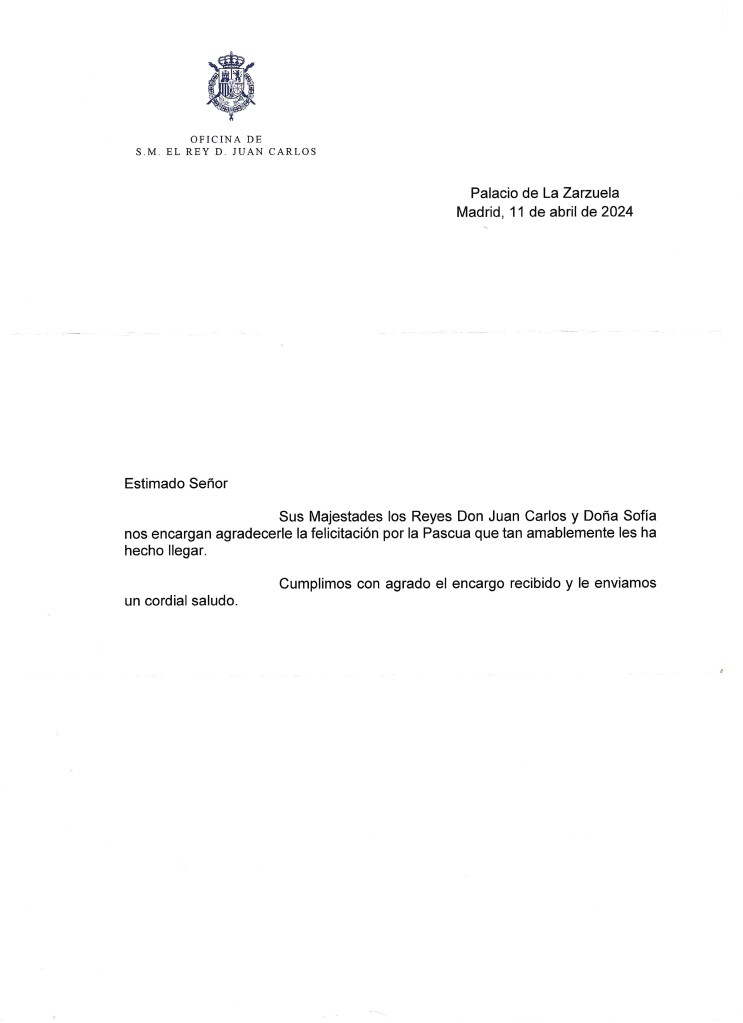 Royal response from Their Majesties King Juan Carlos I and Queen Sofia of Spain on the occasion of Easter 2024.