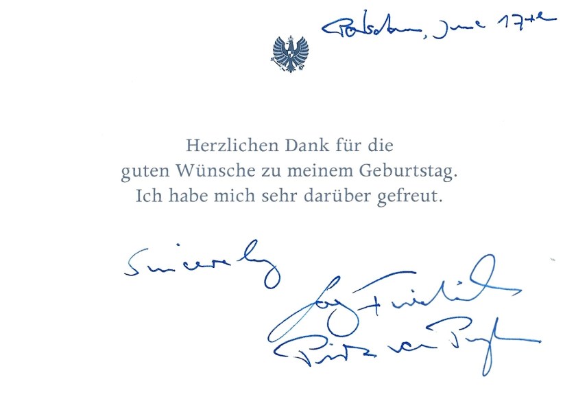 The reply is in the form of a card in German that thanks for my birthday wishes and is hand signed by His Imperial and Royal Highness.