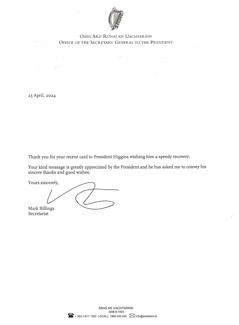 Response from His Excellency The President of Ireland (An Uachtaráin na hÉireann) in response to my get well soon wishes.
