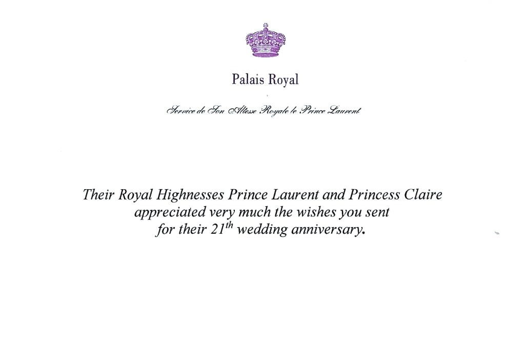 Royal response from Their Royal Highness Prince Laurent and Princess Claire of Belgium on the occasion of their 21st wedding anniversary.