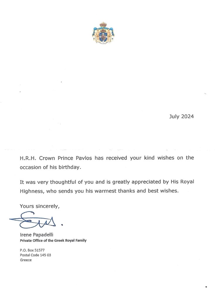 Royal response from His Royal Highness The Crown Prince of Greece on the occasion of his 57th birthday.
